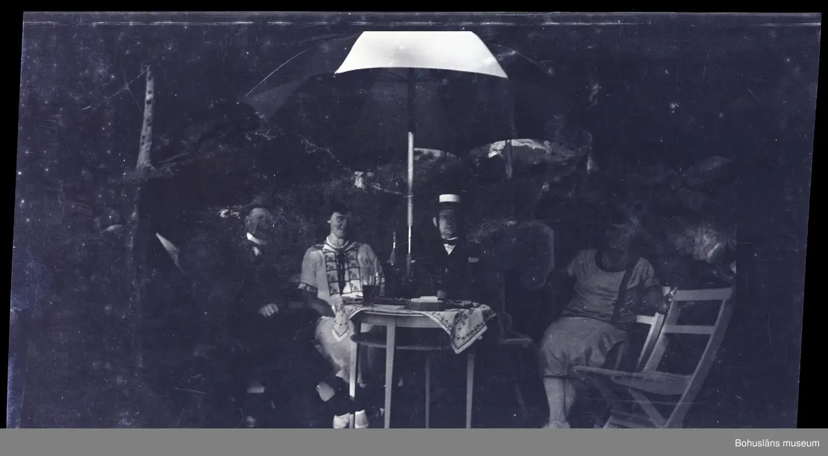 Fyra personer samlade vid ett bord under ett parasoll.