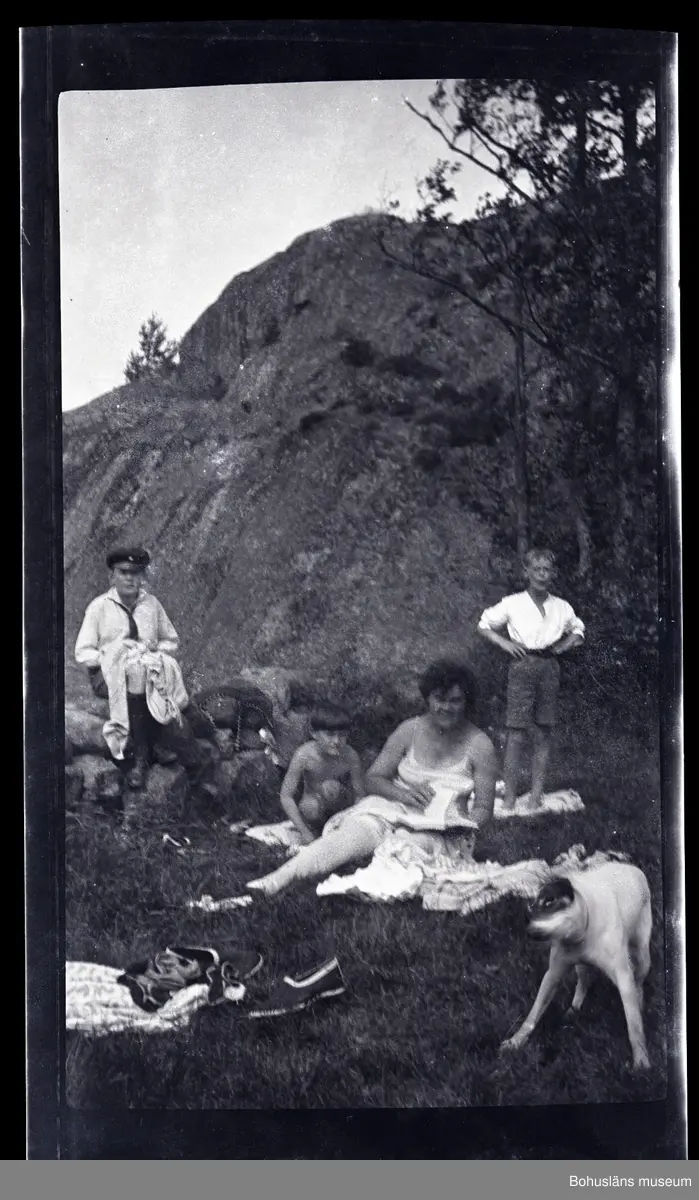 En kvinna och tre barn med en hund i gräset vid en bergskant.
