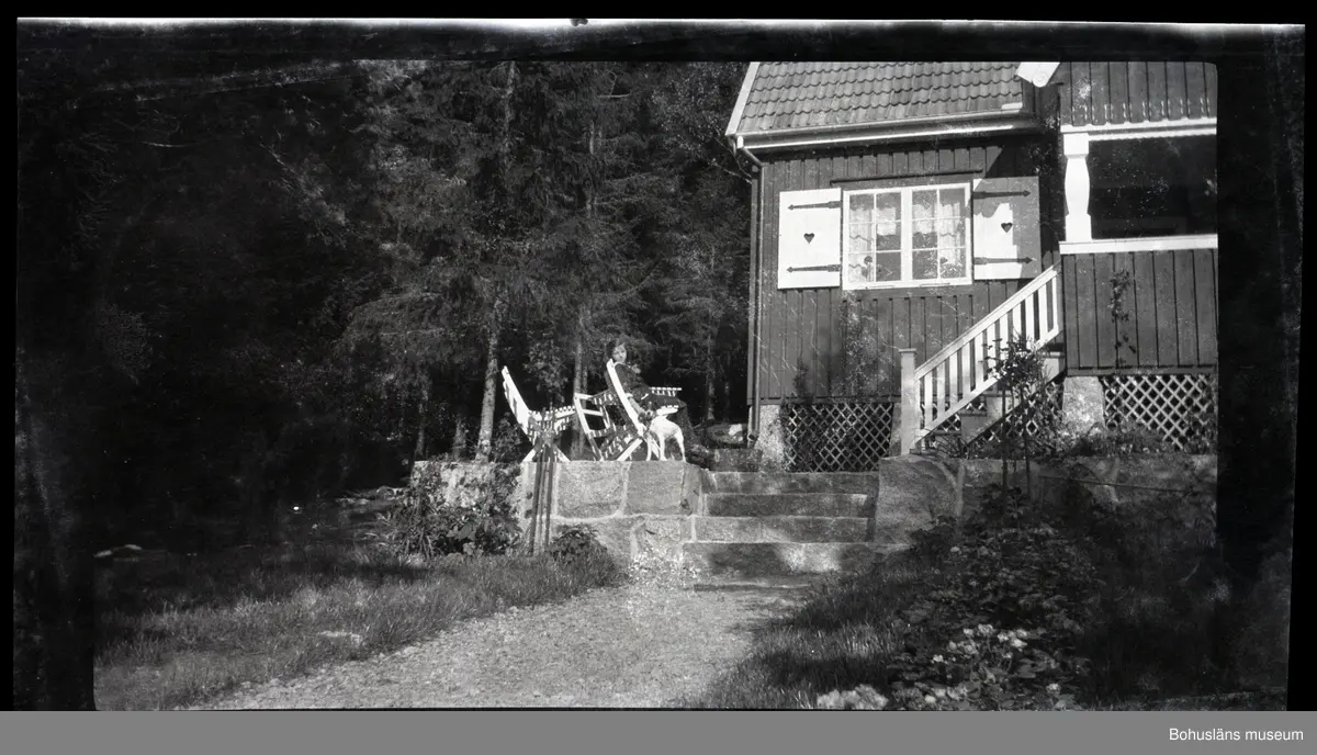 En person sittandes på en trädgårdsstol med en hund i en trädgård.