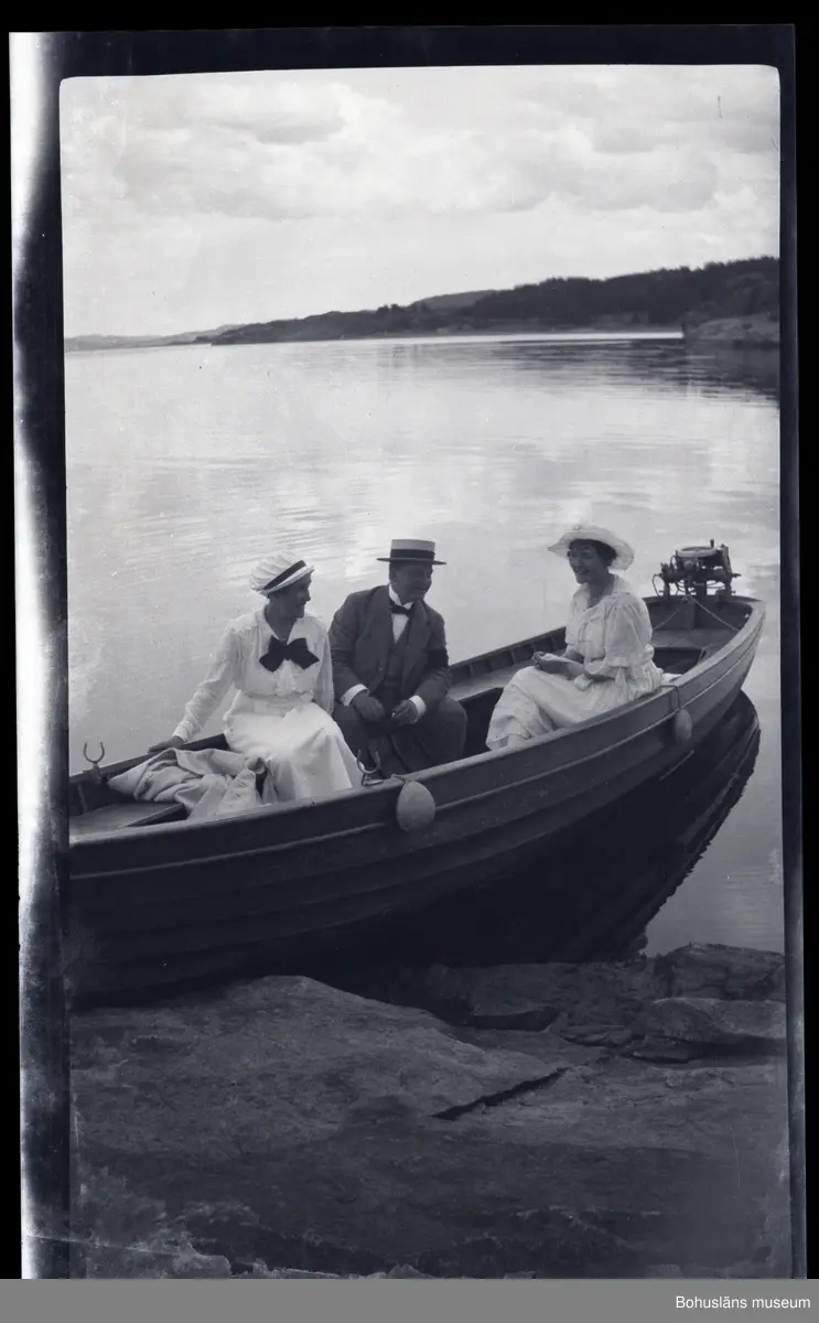 Tre person sittandes i en båt vid en klipphäll.