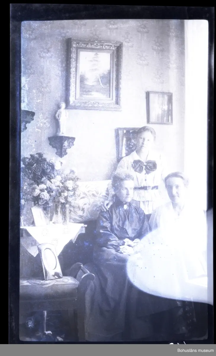 Två personer sittandes i en soffa och en ståendes bakom med ett bord med blommor bredvid.
