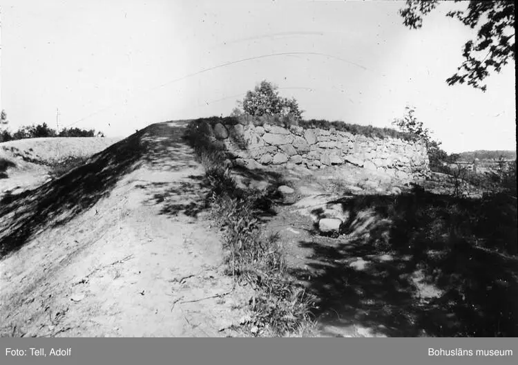 Enligt notering: "Trol Ragnhildsholmens Ruin Fäste Med Kungälv i Bakgrunden"