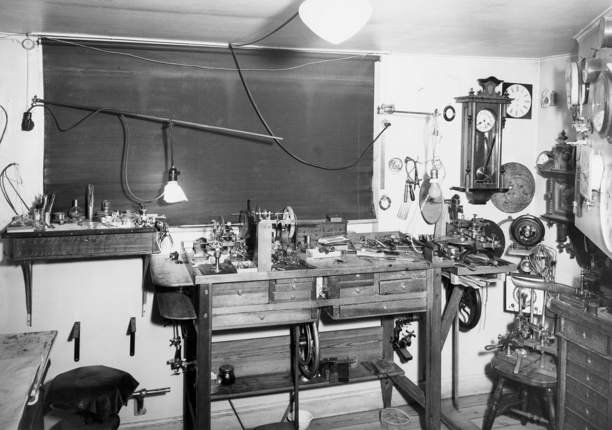 Urmakare C.F. Mattssons verkstad, inre rummet med rullgardin.