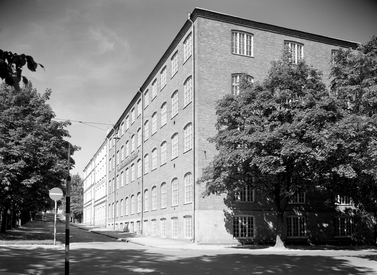 Östlind o Almquists piano- och orgelfabrik i kvarteret Orgeln. Östra Esplanaden uppåt och Fabriksgatan till höger. Bilden tagen 1938.