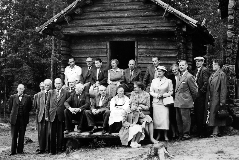 Fjärde från vänster Bror Finneskog. Sittande i folkdräkt Åsta Holth, bredvid henne Anna Halvarsson, bakom dem Halvar Halvarsson