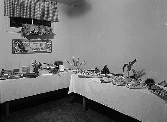 Interiör från Hushållsskolan med bord som är dukade med diverse rätter. Framför fönstrt en stång med runda brödskivor.