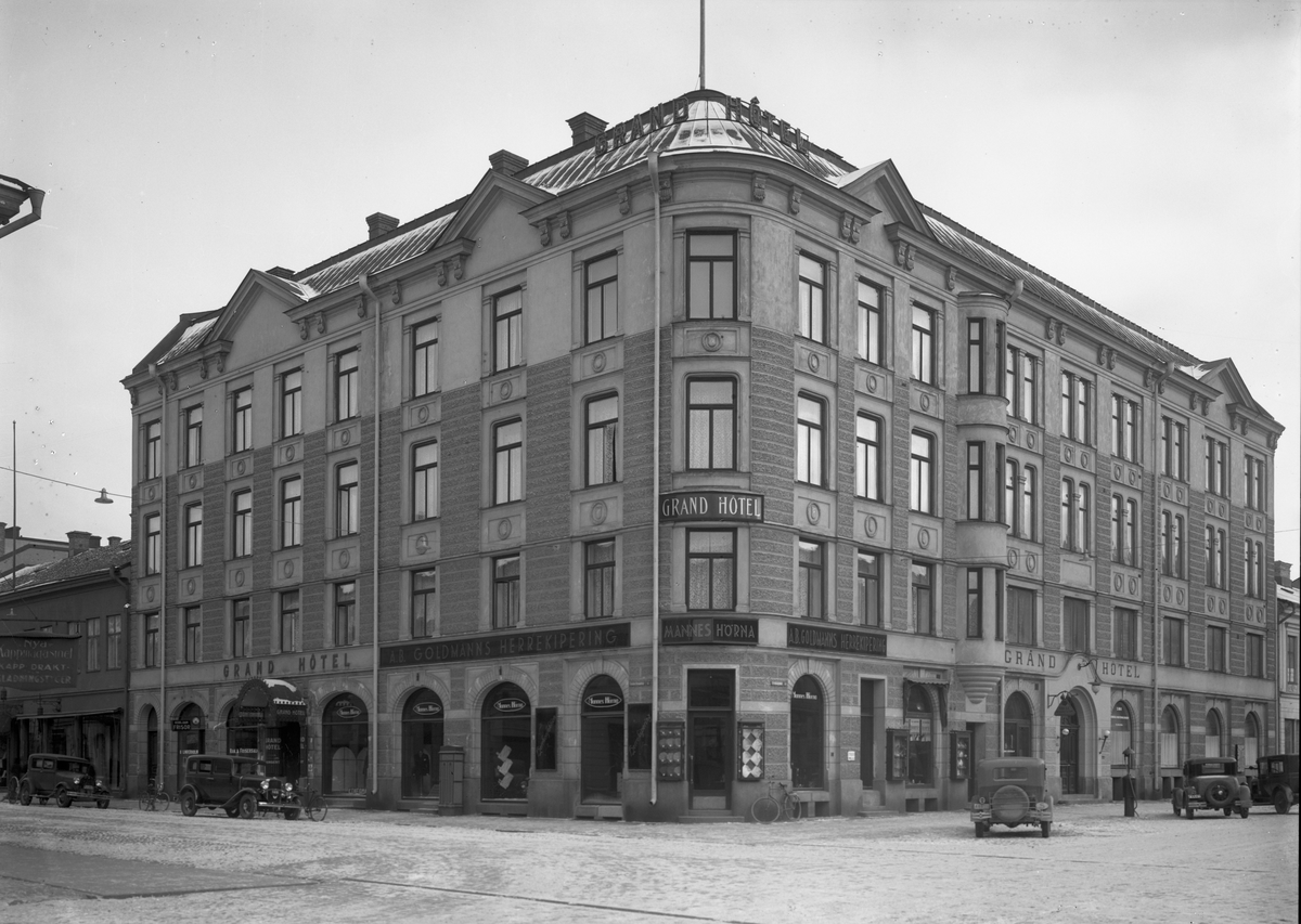 Grand hotell med butikslokaler i bottenplanet; "A.B. GOLDMANNS HERREKIPERING" "MANNES HÖRNA".