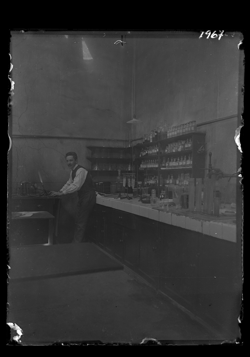 På kuvertet står följande information sammanställd vid museets första genomgång av materialet: Man i laboratoriet.