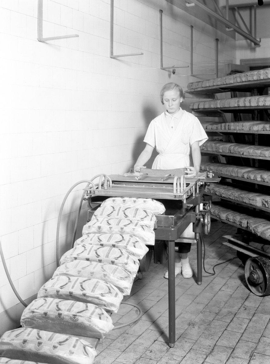 Jeppsons Ångbageri bakar Solstadslimpan på en bild från början av 1930-talet. Bageriet låg i en gårdsflygel till dåvarande fastigheten Långgatan 51.