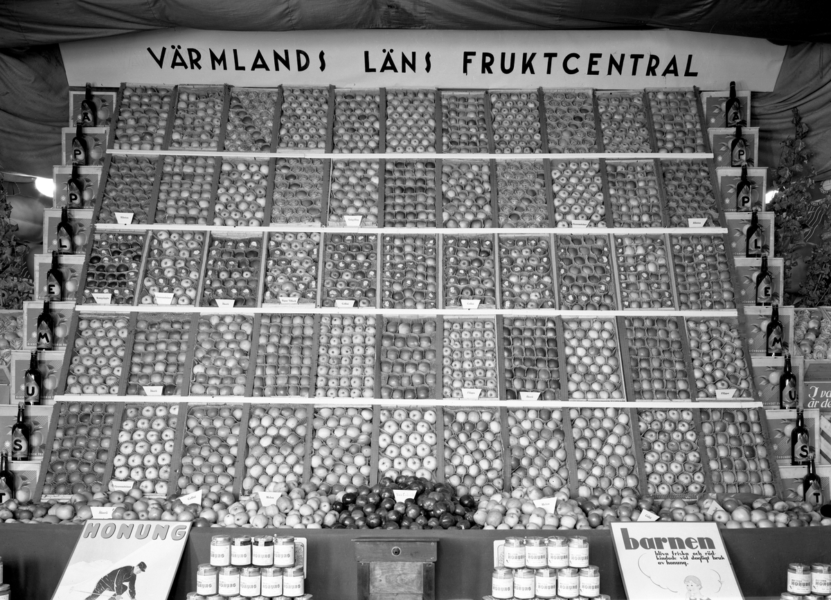 Ett imponerande sortiment av äpplen på denna bild från utställningen Hem och Hushåll som hölls i Expositionshuset vid Hamntorget 1936.