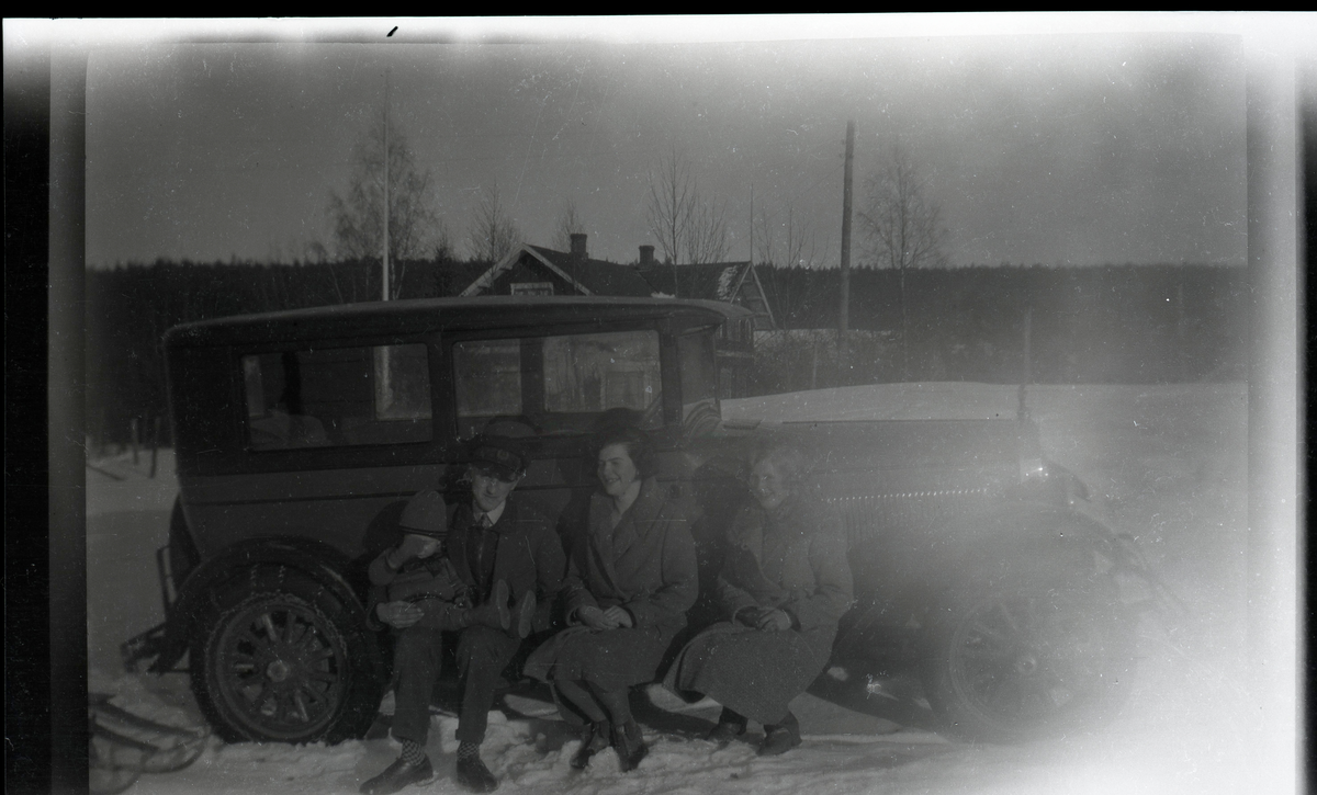 Gruppporträtt framför bil. Till vänster Harald Sundling med barn i knät.