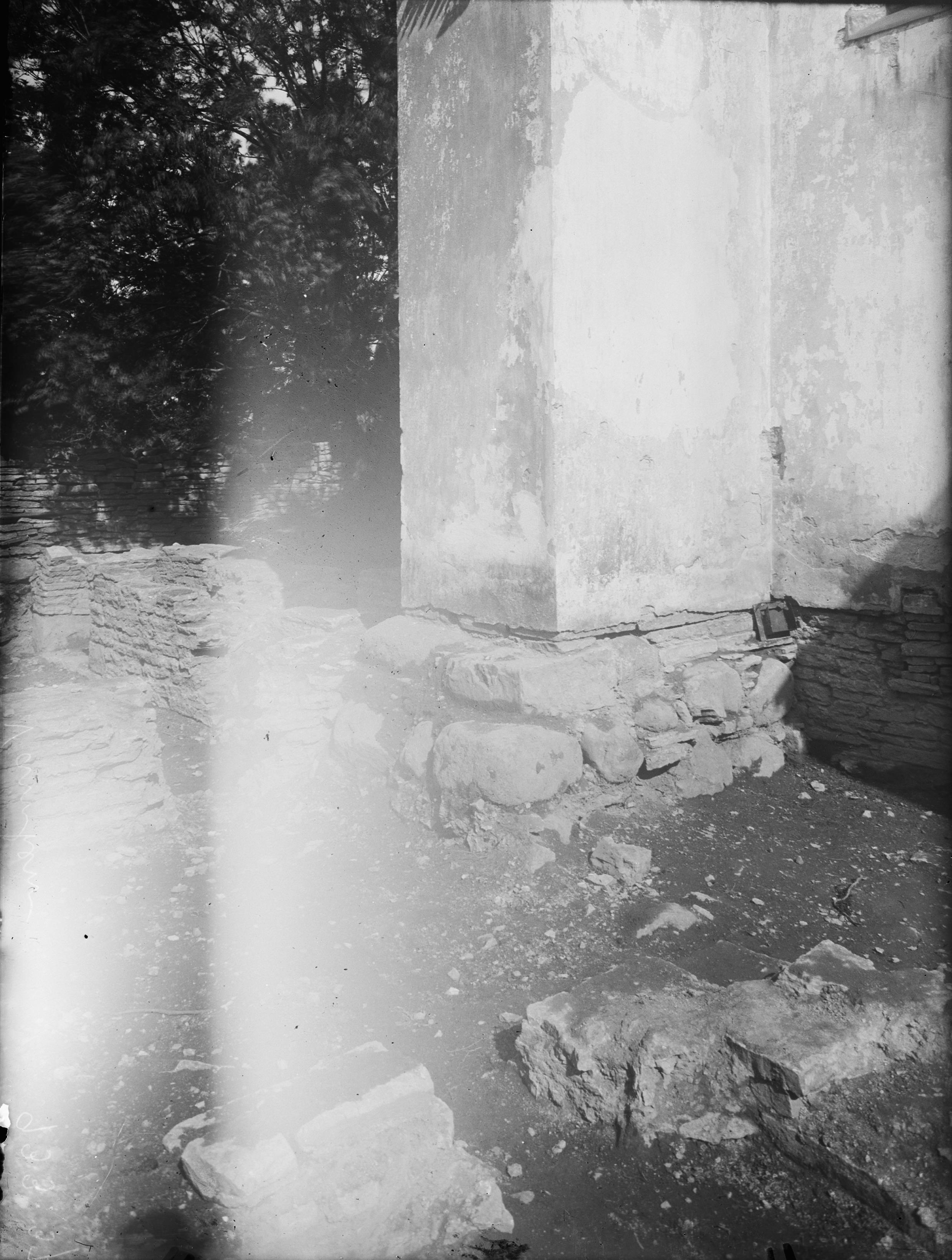 Södra fasadens västligaste strävpelare med framschaktad grund, före grundförstärkning, från sydöst.