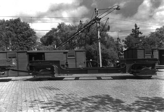Godsvagnar på järnvägsspår med järnkonstruktion i förgrunden.