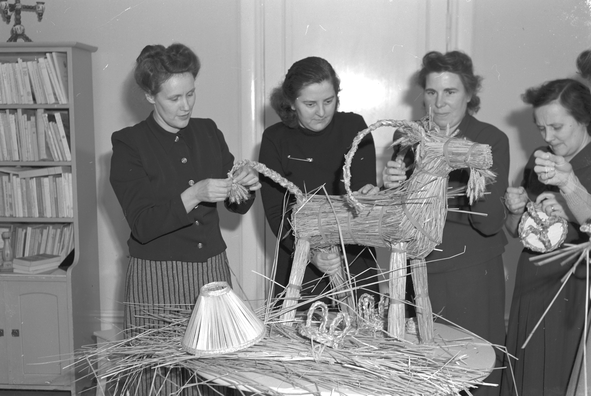 Hemgårdens halmkurs i tillverkning av julprydnader. 12 december 1948. Reportage för Arbetarbladet.