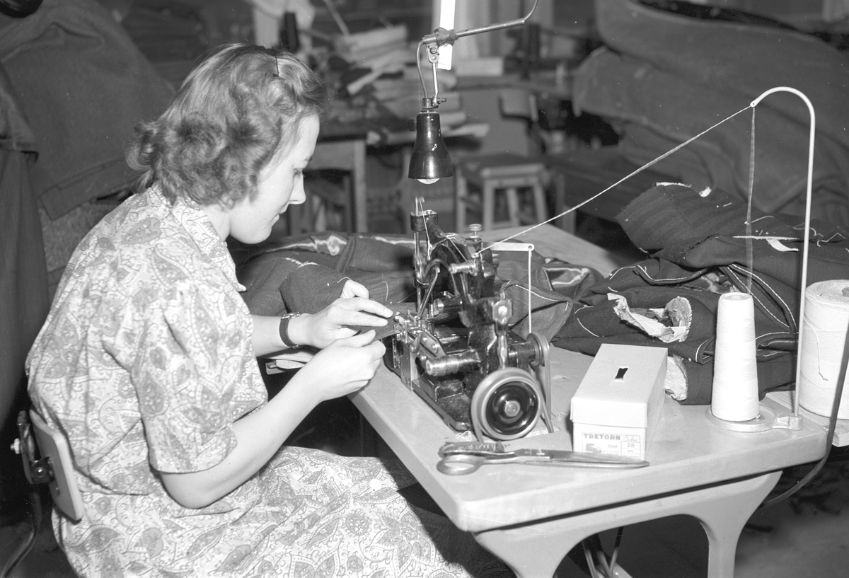 Storviksbilder reportage för Gefle Dagblad. 5 december 1948. Hermanssons konfektionsfabrik från Stockholm har öppnat filial i Gröna Caféet, Parkhallen, Storvik. Harry Blomberg är chef och på bilden sitter fru Elsie Gustafsson från Västerberg och syr på en överrock.