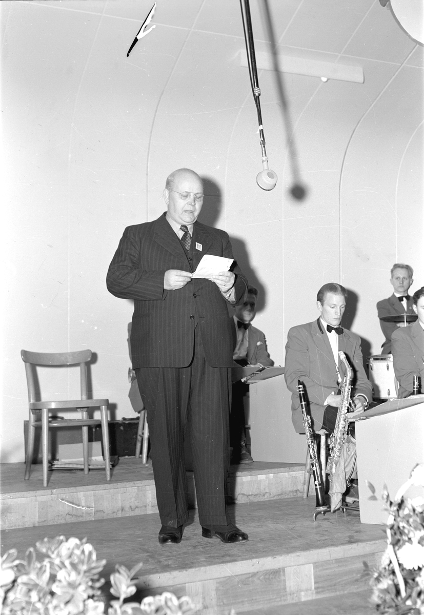 Konsum Alfa 50-årsjubileum på Rotundan, Folkparken. Medaljutdelning och middagsbord. 25 november 1948.
