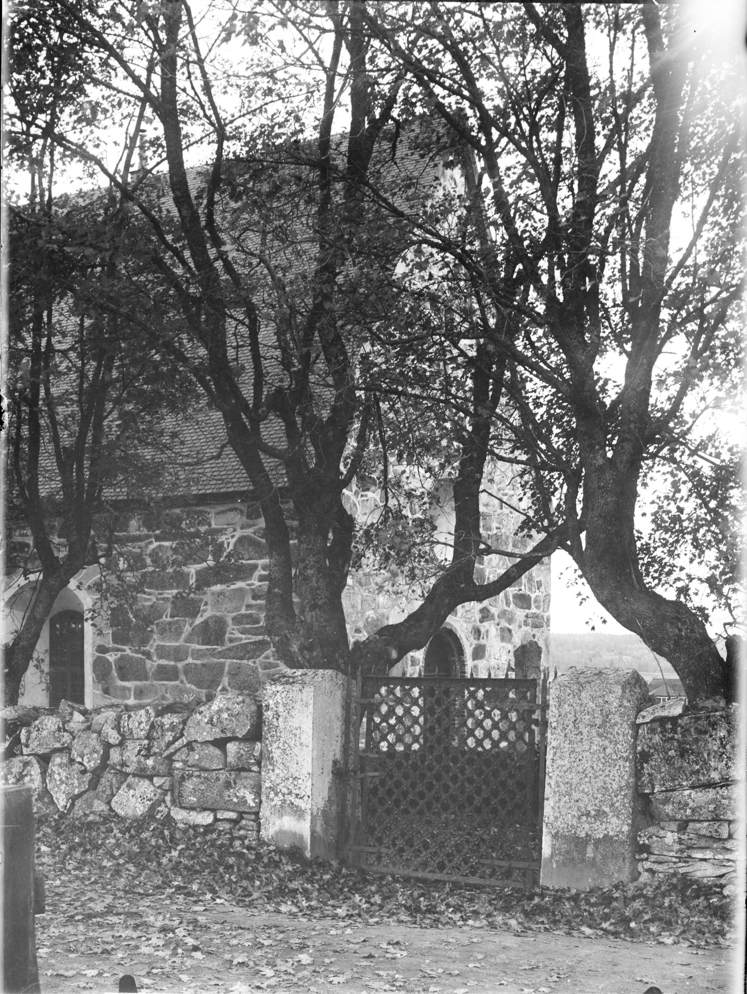 Kyrkan mot nordväst, kyrkogårdsgrind på norra sidan.