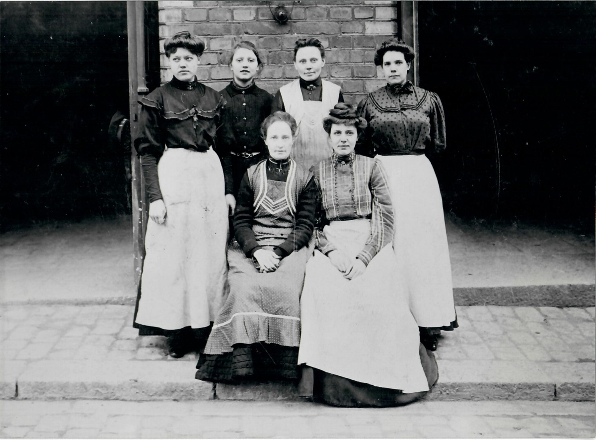 På baksidan står: Bakre raden andra från vänser, Anna Persson. Anna Persson började som 13-åring 1907 på Hellgrens tobaksfabrik. Båda föräldrarna arbetade på fabriken, modern som (oläsligt), fadern som tunnbindare. Även morfadern Jacob Anusius " Vackre Jacob" kallad, var anställd vid samma fabrik.