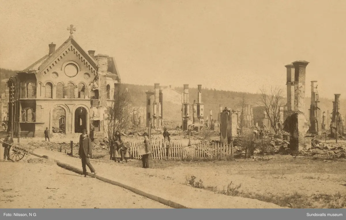 Sundsvalls stadsbrand 1888. Brödraförsamlingens kapell (Betlehemskyrkan) i korsningen Köpmangatan - Skolhusallén. Kvar efter de brandhärjade husen finns bara ruiner och det rör sig några människor bland brandresterna där någon bär på bohag.