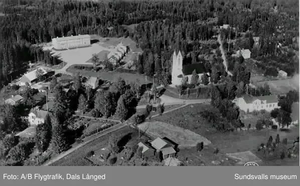 Vykort. Flygfoto över Anundgård. Skolan, byggd 1952, överst t v, kommunala lärarbostäder (bl a bodde läraren och kantorn Mauritz Öhnedal där). T v syns prästgården och i träddungen mitt emot lagården är nya affären. Huset nere t h är gamla skolan, nu (1987) församlingshem.