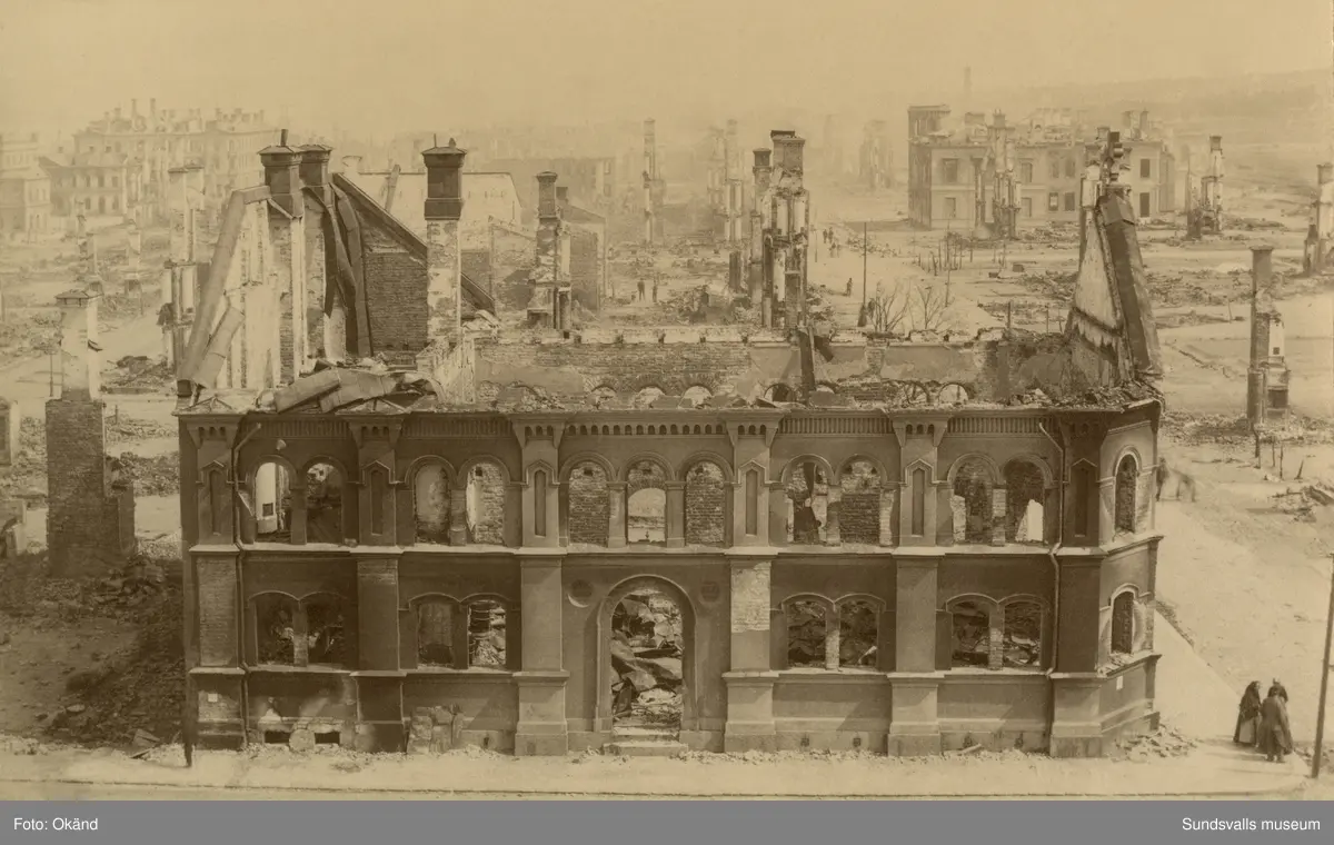 Sundsvalls stadsbrand 1888. Resterna av den nedbrunna Betlehemskyrkan, senare Frimurarhuset.