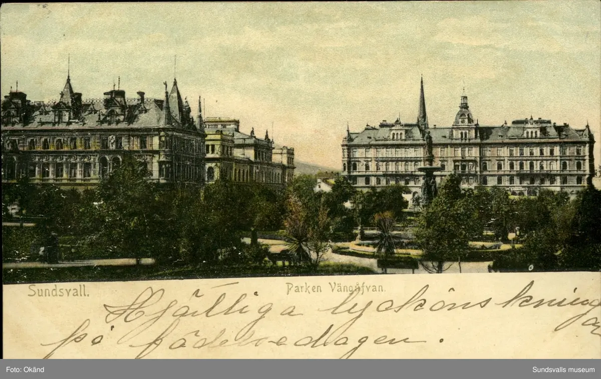 Vykort över Vängåvan i Sundsvall. Med Hoppets här, Stadshuset och Hirschskahuset i bakgrunden.