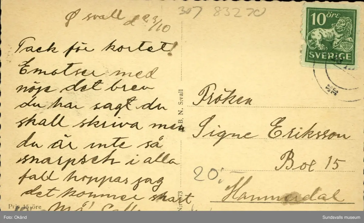 Vykort med motiv över Handelsinstitutet i Sundsvall.