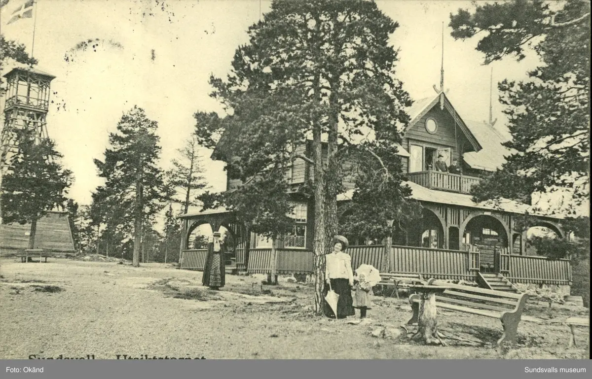 Vykort med motiv över Utsiktstornet och Turistpaviljongen i Sundsvall.