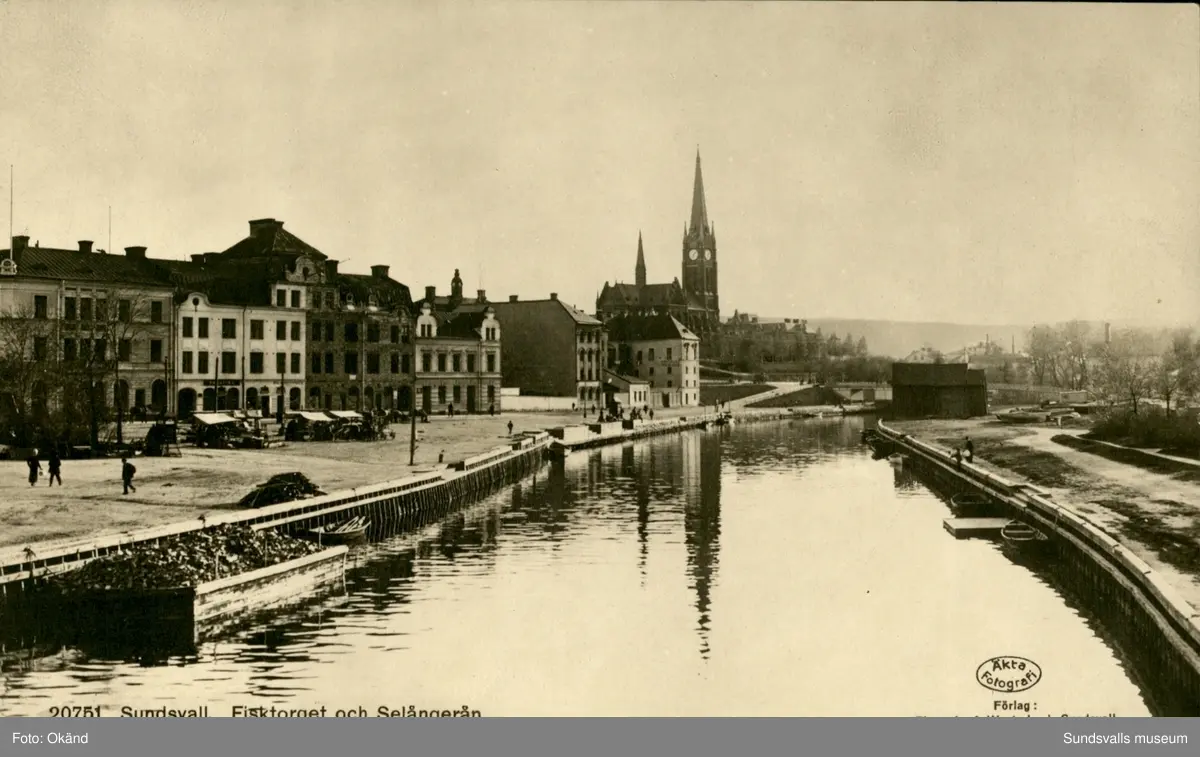 Vykort med motiv över Fisktorget och Selångersån i Sundsvall.