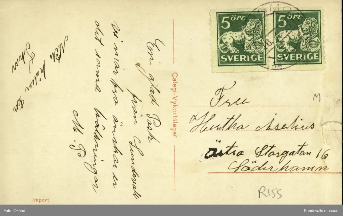 Vykort med motiv över Selångersån med Gustav Adolfs kyrka i bakgrunden.