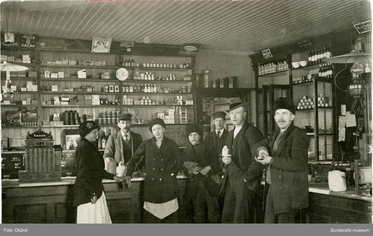 Interiör från en okänd handelsbod i Sundsvall. Butikspersonal och kunder. Vykort.