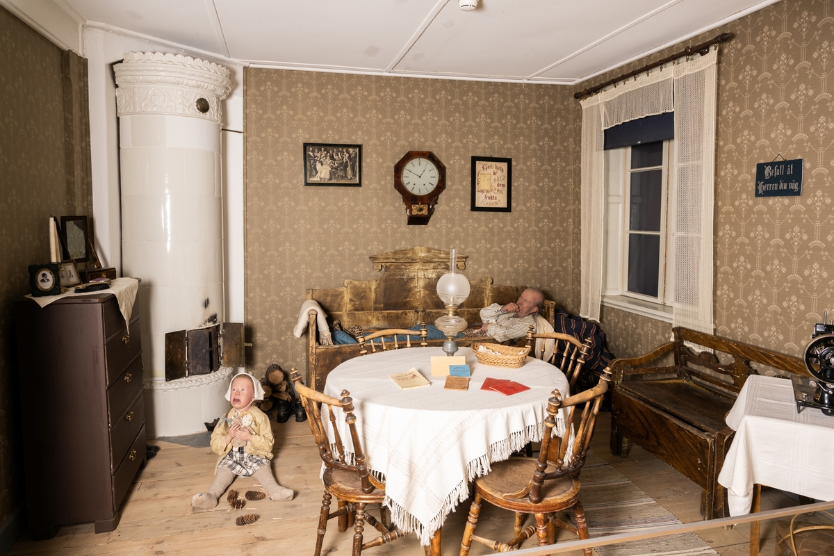 Tändsticksarbetarbostaden. Utställningen består av en miljöinteriör med kök och rum för en tändsticksarbetarfamilj i Jönköping omkring 1900. I miljön är dockor placerade med tidsenliga kläder. I bostadens rum ligger morfar, tidigare tändsticksarbetare, sjuk i utdragssoffan och hostar. På golvet sitter familjens yngsta dotter och leker med kottedjur. Hon känner sig övergiven och gråter. På matbordet ligger bland annat en medlemsbok för Svenska Grof- och Fabriksarbetareförbundet.