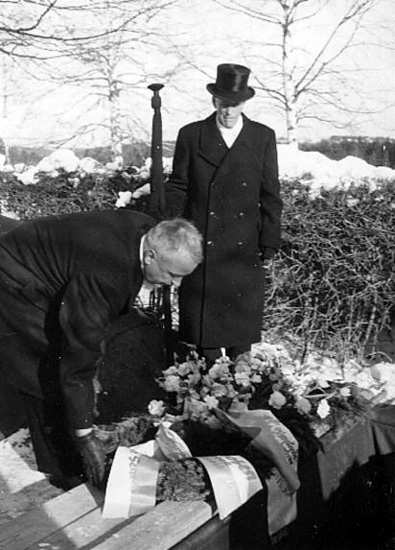 Sekreterare i Niittahon Jussin Seura Helsingfors Urho Juha nedlägger president Urho Kekkonen krans vid Nittaho-Jussis grav på Nyskoga kyrkogård 27/2 1965.