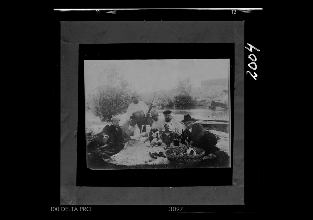 På kuvertet står följande information sammanställd vid museets första genomgång av materialet: På jakt och fisketur