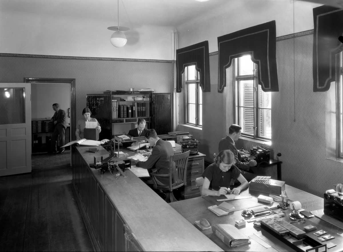 A-B. Bergsson och söner; interiör av fabriken. Kontorspersonal i arbete.