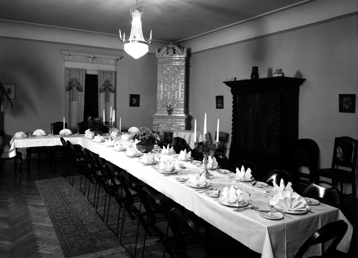 Kakelugn och dukat bord.