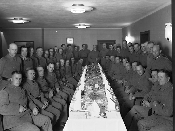 Större samling män framför dukat långobrd.
