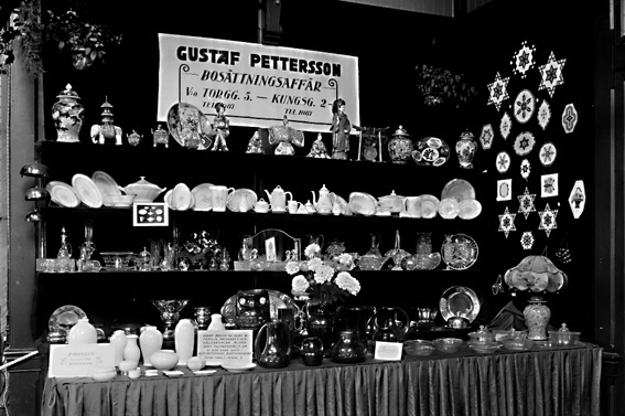 Monter för "GUSTAF PETTERSSONS BOSÄTTNINGSAFFÄR" "V:a TORGGATAN 5 - KUNGSGATAN 2", fylld med husgeråd.