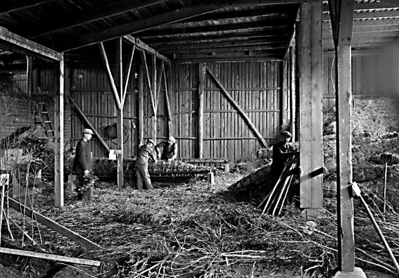 Fyra män i arbete i lada.