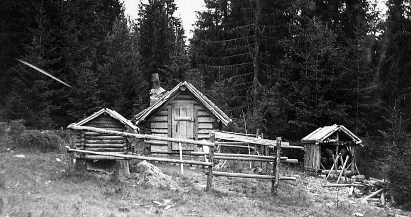 Lilleputtbostad knappt 2 m hög, gjord av små timmerstockar, med matbod och vedbod.