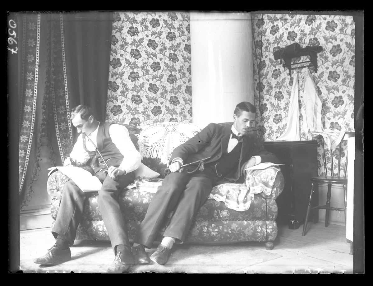 På kuvertet står följande information sammanställd vid museets första genomgång av materialet: 2st män sitter och läser.