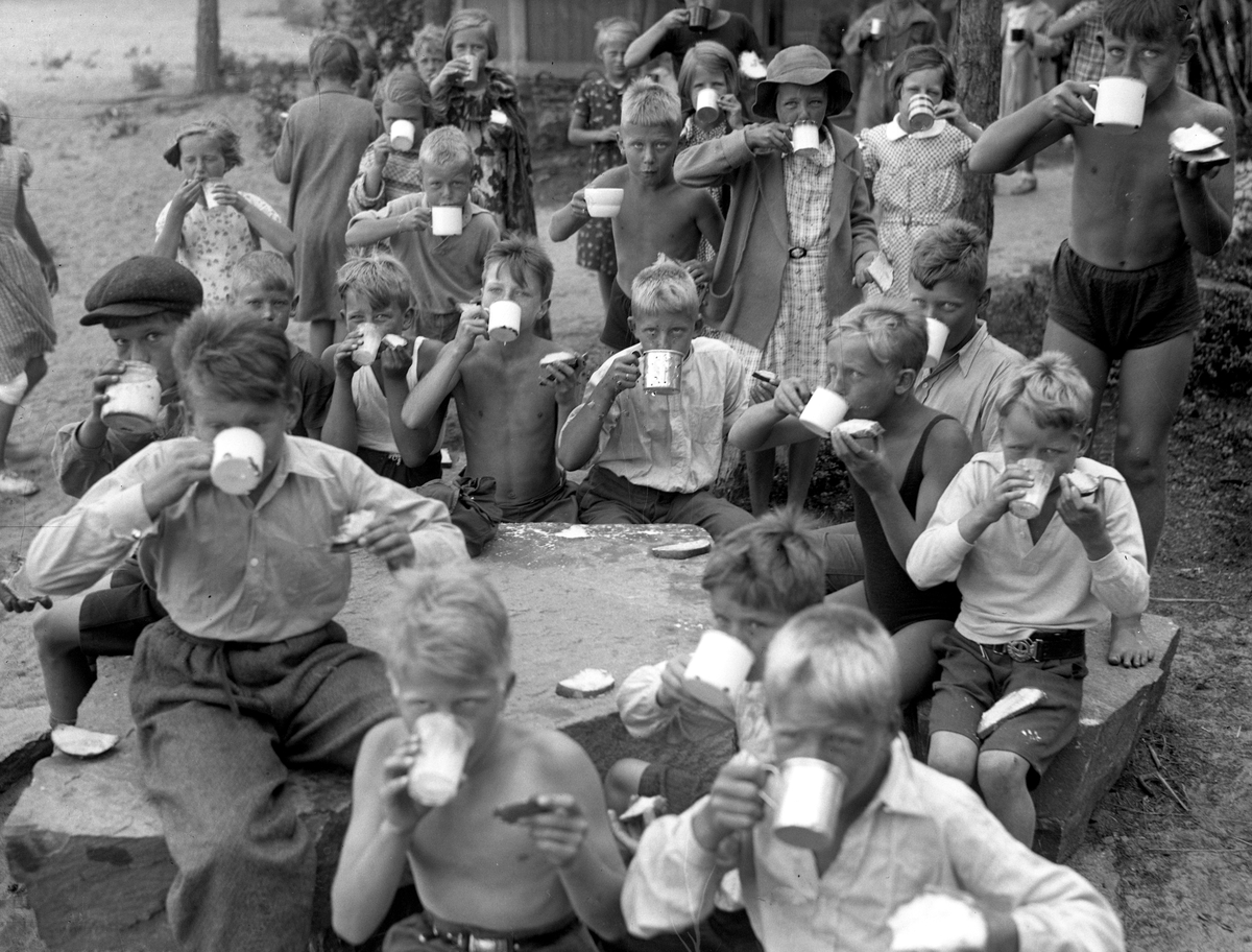 Karlstad stads barnläger vid Alsters strandbad år 1936. Den ursprungliga förlagan till senare tids Bomstads-, Örsholms- och Sundstaläger.