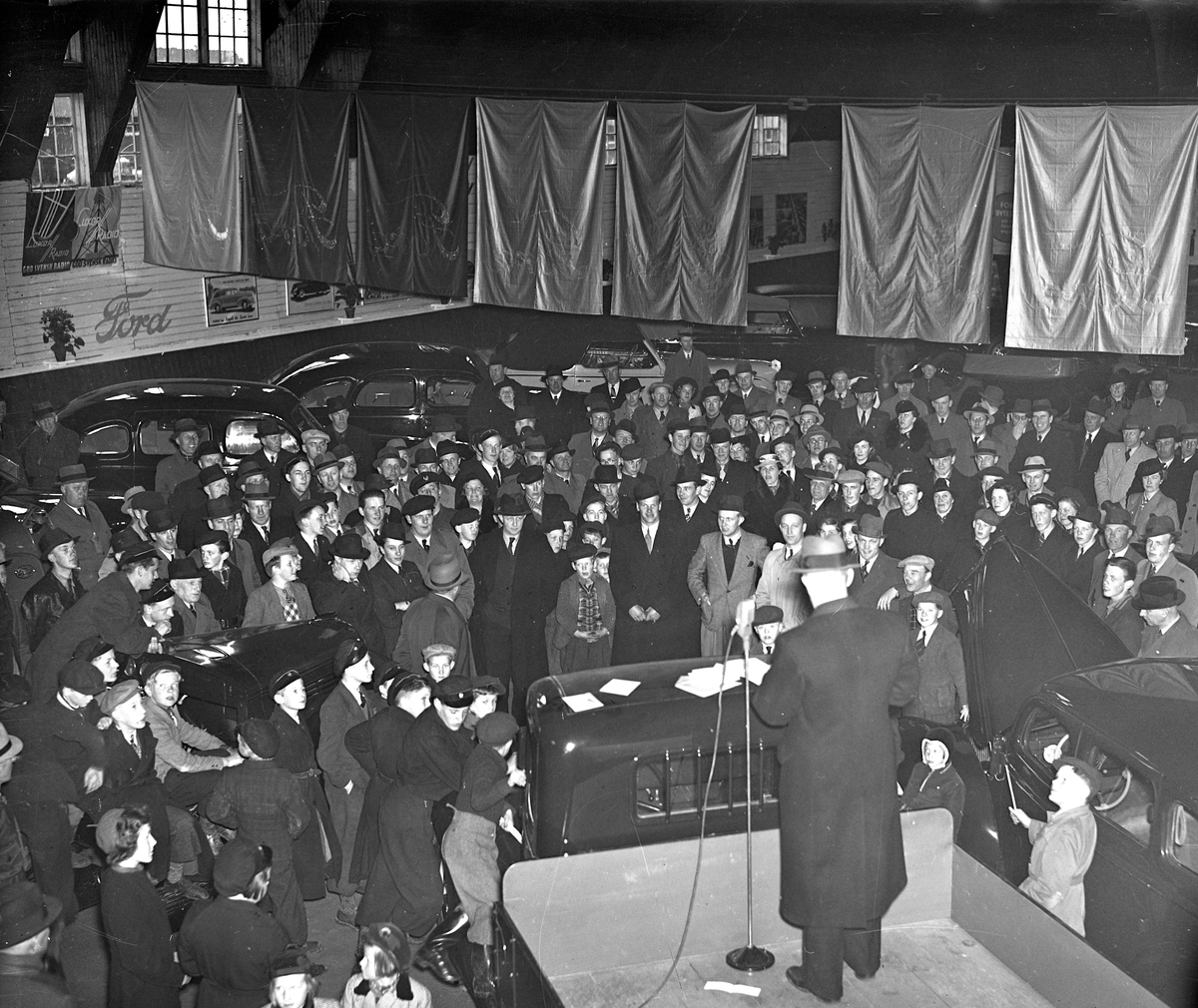En utställning med fordon från Ford i och omkring det vid vid fototillfället före detta ridhuset som låg alldeles väster om Karolinen. Bilden tagen 1939.