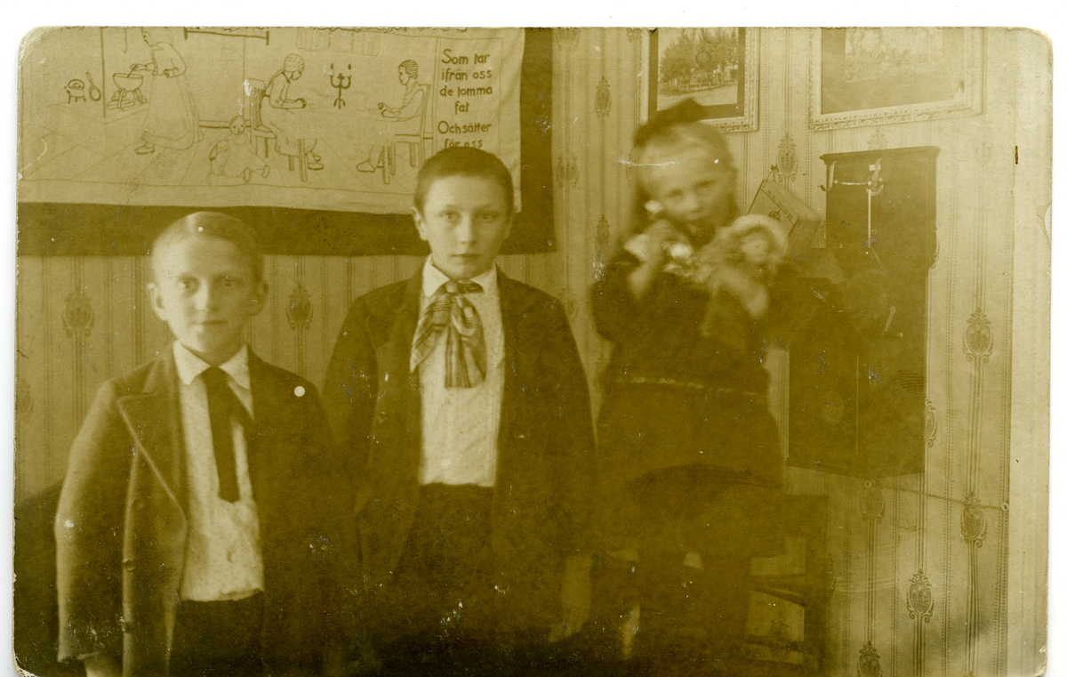 Gruppbild, barn. Från vänster, Harald, Georg och Karin Sundling.