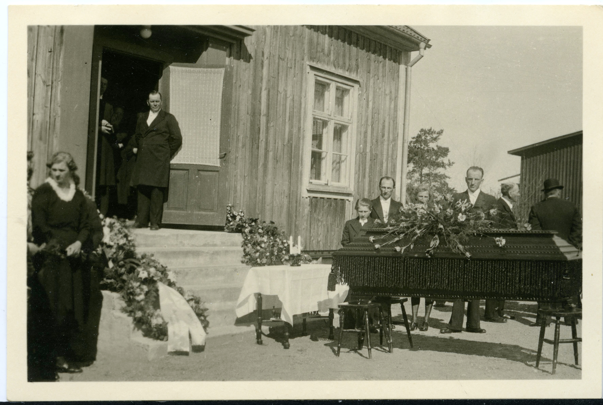 Kista, blommor, människor vid Dagny Sundlings begravning.
