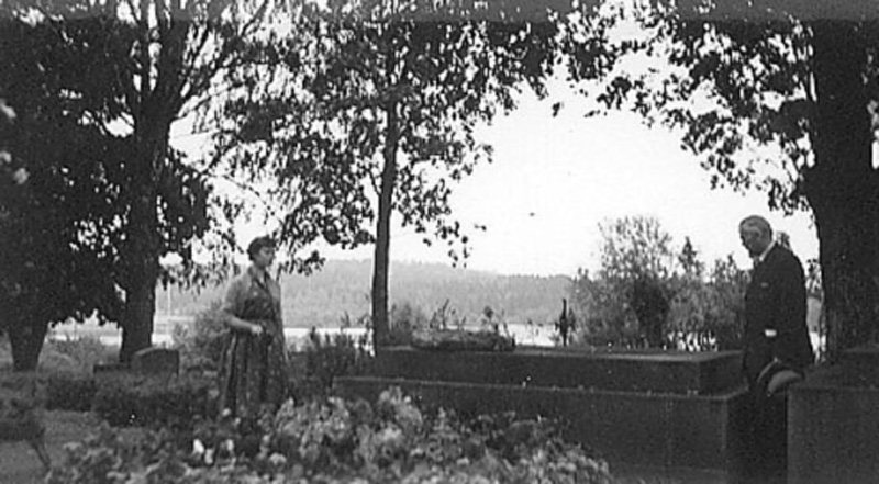 Sigyn Erligh och finske folkloristen fil.dr Rafael Sugelberg från Helsingfors, vid Selma Lagerlöfs grav på Östra Ämterviks kyrkogård.