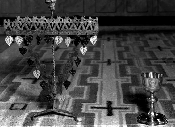 Medeltida ljusstake i järnsmide samt, nattvardskalk i silver. Ljusstaken är Alsters församlings älsta inventarie och har plats för åtta ljus. De karaktäristiska bladen tillfördes för cirka 100 år sedan.