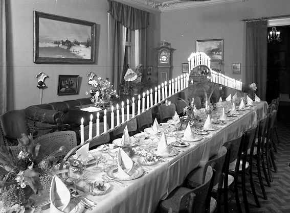 Långbord dukat med tallrikar, glas, bestick, servetter, blomsterarrangemang samt en stor bågformad ljusstake som sträcker sig över hela bordet.