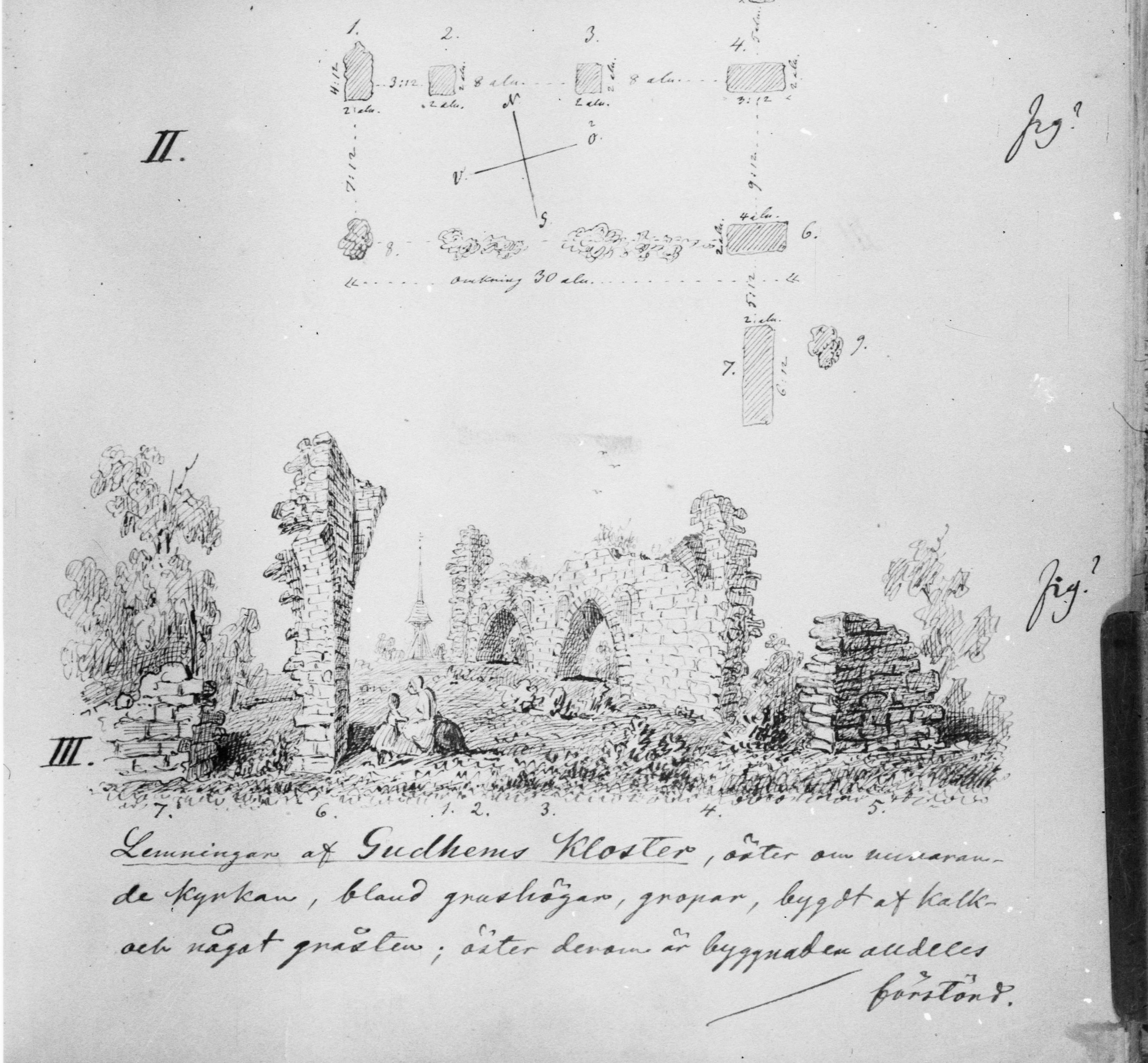 Klosterruinen. Foto efter teckning ur P.A. Säves Berättelse 1863.