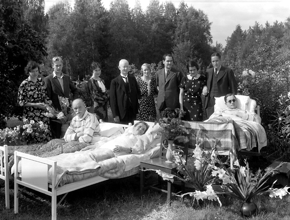 Titel: En grupp människor i trädgård varav tre ligger i sängar.